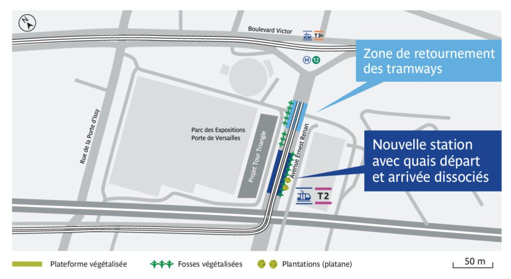 Afin de mieux absorber les aléas de la ligne T2, une zone de retournement est en cours de création. Ce chantier, confié à l’agence Île-de-France d’ETF, a pour but de réduire l’intervalle entre les passages des tramways à 3 minutes 30. Une nouvelle configuration permettra d’offrir un service régulier aux 5 millions d’usagers mensuels Cette reconfiguration du terminus s’accompagne d’une meilleure intégration de la plateforme du tramway dans son environnement afin de mieux accompagner les voyageurs dans ce secteur en pleine transformation. La mobilisation de l’agence Île-de-France d’ETF (en groupement Chantiers Modernes Construction) et particulièrement du secteur RATP ont permis de mettre en œuvre 500 mètres linéaires de voies, une communication croisée ainsi qu’une communication simple. Un chantier qui a dû tenir compte des importants travaux en cours tels que l’ouvrage d’art du périphérique parisien, la construction de la tour Triangle ou des nombreux salons qui se sont tenus au parc des expositions.