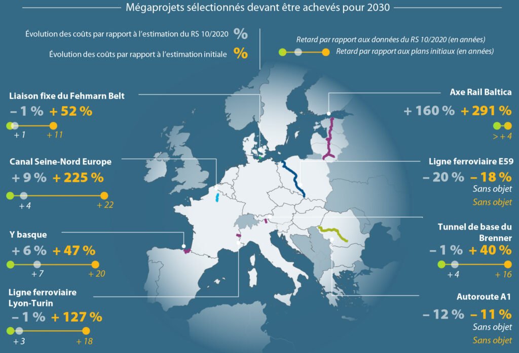 Intitulé « Infrastructures de transport de l’UE – Des retards persistants et des coûts en hausse, mais un cadre de gouvernance renforcé pour l’avenir (actualisation du rapport spécial 10/2020 ) », ce nouveau rapport actualise celui effectué en 2020. Il vise à dresser le bilan de l’évolution des coûts et des délais de 8 mégaprojets de transports dont :